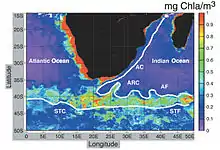 Having left the retroflection, the ARC meanders east between 36°S and 41°S.[5] These meanders were described as Rossby waves in 1970[6] and are known to shed cold eddies equatorward and enhance the primary productivity at the Subtropical Front.[7] The ARC makes a large, quasi-permanent northward meander around the Agulhas Plateau after which it loses more velocity and volume by leakage into the South Indian subtropical gyre. Over the Crozet Basin the last remnants of the ARC are gone.[4] As it enters the Crozet Basin at 53°E, the transport of the ARC is 35 Sv, most of which is recirculated northward before reaching the Kerguelen-Amsterdam Passage.[8] The current east of the Crozet Basin, at 66°E-70°E, is called the South Indian Ocean Current and lacks the distinctive features of the ARC.[4]
