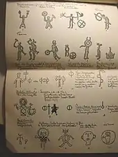 The organisation was initially named the "Deutsches Ahnenerbe Studiengesellschaft für Geistesurgeschichte" (Society for the Study of the History of Primeval Ideas), but this was soon shortened to Ahnenerbe.[27] This was a German term for "something inherited from the forefathers".[28] The Ahnenerbe's first premises were at number 29 and 30 of the Brüderstrasse, a thirteenth-century street in Berlin. These corner buildings were rented from the city's department store magnate Rudolf Herdzog.[29] Initially, it employed seven members of staff.[29] Reflecting Wirth's fixation on the idea of an ancient Aryan script, the organisation's early focus was upon what Wirth called "script and symbol studies".[21] One of its researchers, Yrjö von Grönhagen, was for instance tasked with collecting the Finnish wooden calendars which were engraved with various symbols.[21]