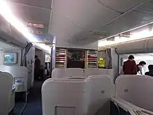 On the Boeing 777-300ER and Boeing 787, Business Class would be located at the front of the cabin in a 2-2-2 configuration. The seats on some Boeing 777s were grey with full recline and IFE screens while Business Class on other Boeing 777s and all Boeing 787s were dark blue and cocoon shaped with seat-back IFE screens.