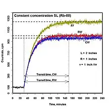 Also in both plots the transit times are indicated; note that these times are measured from the start of the concentration, at time 30 minutes, not from the arbitrary time zero of the plots. In these example graphs, the length of the RW and the diameter of the CW are equal; if they were not equal, then the transit times would not be equal.