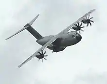 The Airbus A400M Atlas[28][29] is a multi-national, four-engine turboprop military transport aircraft. It was designed by Airbus Military (now Airbus Defence and Space) as a tactical airlifter with strategic capabilities to replace older transport aircraft, such as the Transall C-160 and the Lockheed C-130 Hercules.[30] The A400M is positioned, in terms of size, between the C-130 and the C-17; it can carry heavier loads than the C-130, while able to use rough landing strips. Along with the transport role, the A400M can perform aerial refuelling and medical evacuation when fitted with appropriate equipment.