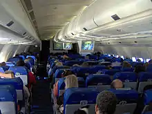 There is some ambiguity about the meaning of "seat width". It can be taken as the width enclosed by the armrests on each side, i.e., the width available to sit in, or as the distance from the midpoint of one armrest to the midpoint of the next, a larger figure by the width of an armrest, and the width available for the shoulders (it is also one-third of the width of a block of three identical seats). It is thought that most airlines use the first of these figures.[15] In Economy class this width was typically 43 to 46 centimeters (17 to 18 in) in 2003.[16]