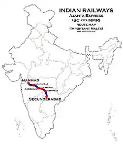 The 17063/64 Ajanta Express is an Express train belonging to the South Central Railway Zone that runs between Secunderabad in Telangana and Manmad in Maharashtra in India.
