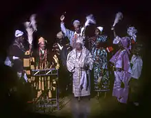 The jewellery is very ample and used to be made of gold. Nowadays, most chiefs wear imitation gold. The head-dress usually takes the form of a crown. It can be made of metal or of black velvet, ornamented with metal. Chiefs have traditional sandals, and the wearing of sandals is symbolic for them. When a chief abdicates, he takes off his sandals.