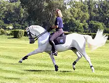 In the early twentieth century, crossbreeding between the Thoroughbred and the Akhal-Teke took place, aiming to create a faster long-distance racehorse.[25] The Anglo Akhal-Tekes were not so resilient however, as their Akhal-Teke ancestors, and many died due to the harsh conditions of Central Asia. After the 4,200-kilometre (2,600 mi) endurance race from Ashkabad to Moscow in 1935, when the purebreds finished in much better condition than the part-breds, the studbook management decided to consider all crossbred horses born after 1936, as not purebred. Horses with English Thoroughbred ancestors born prior to that date were allowed to remain inside the studbook (e.g. 044 Tillyakush, grandson of Thoroughbred Burlak, 831 Makh, granddaughter of Thoroughbred Blondelli and great-great-granddaughter of Thoroughbred Junak, and line founder 9 Ak Belek, a direct descendant in the male line of the Thoroughbred stallion Fortingbrass). Due to this fact there doesn't exist any Akhal-Teke today whose ancestry doesn't contain a Thoroughbred.[26] Since 1973, all foals must be blood typed to be accepted in the stud book in order to protect the integrity of the breed. From 2014 on, a DNA test based on hair follicles is sufficient if the DNA of the parents is on file.[27] A stallion not producing the right type of horse may be removed. Nowadays, artificial insemination is allowed as well as embryo transfer. The surrogate mother, however, needs to be a pureblood Akhal-Teke mare for the foal to be registered in the General Studbook as a pureblood Akhal-Teke. Akhal-Teke horses are bred all over the world. In addition to Turkmenistan there are breeders in Russia and Central Asia, Europe, the US, Uruguay, and Australia.[28]
