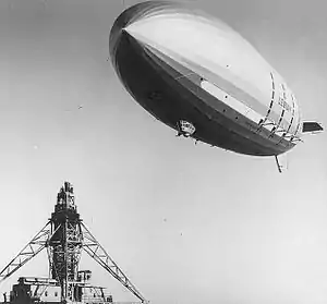 | USS Macon preparing to tie up to the mooring mast at NAS Moffett Field in October 1933 | |