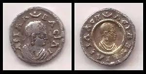 Coins of Ezana without any symbol at all have also been found, along with similar symbolless coins of his father, Ousanas. These may reflect a transition in the religion in Aksum when Frumentius was influencing Ezana's father and gathering Christians in the country, giving weight to the writings of Rufinus.[21] The lack of symbol altogether may reflect an uncertainty as how best to exhibit the change in religion of the Aksumite state.[22]
