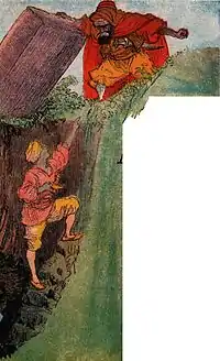![]() Aladdin finds the wonderful lamp inside the cave. A c. 1898 illustration by Rene Bull. | |