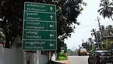 Kerala hill highway (SH 59) passes through Alakode town which connects it with other towns like Cherupuzha, Karuvanchal, Chemperi, Payyavoor, Iritty etc. Mysore and Bangalore can be accessed from east of Ulikkal or Iritty.[6] Taliparamba-Coorg border road is another major road connecting Alakode with Taliparamba and Manakadavu. National Highway (NH 66) passes through Taliparamba town. Goa and Mumbai can be accessed on northern side and Kochi and Trivandrum are accessible from southern side.