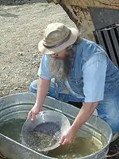 Dexter Clark, shown in May 2002 demonstrating gold panning to tourists at the El Dorado Gold Mine, is a former chairman of the AKIP.