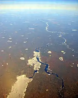 The Albany River is a river in Northern Ontario, Canada, which flows northeast from Lake St. Joseph in Northwestern Ontario and empties into James Bay. It is 982 kilometres (610 mi) long to the head of the Cat River (a tributary of Lake St. Joseph),[1] tying it with the Severn River for the title of longest river entirely in Ontario. Major tributaries include the Kenogami River and Ogoki River.