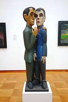 In 1923, Müller became acquainted with the expressionist Ernst Ludwig Kirchner.[12] The Kunsthalle Basel held the first representative exhibit of Kirchners works of Switzerland in June 1923, which would influence Müllers and his friend Hermann Scherers works in the future.[12] In October 1924, Otto Staiger Hermann Scherer and Albert Müller exhibited some water color paintings in the store windows of a book shop in the hope to break the exclusion from the exhibitions of the Kunsthalle.[13] The exhibit drew quite some attention from the critics and was also described the art magazine Der Cicerone.[13] Müller then invited Hermann Scherer to Obino for Christmas and New Year's Eve in the winter of 1924-1925.[14] And in the night of New Years Eve, Albert Müller, Hermann Scherer and Paul Camenisch founded the artist group Rot-Blau in Obino.[14] Later, also Werner Neuhaus would be a part of the group.[14] The young painters were not yet as successful, and usually lost against the older artist generation in the competitions.[14] In the years between 1924 and 1926, he was a frequent guest with Ernst Ludwig Kirchner in Davos Frauenkrich. Between the families of Kirchner and Müller a friendship developed and of Kirchner six paintings portraying members of the Müller family are known and a wooden sculpture of Albert Müller with Hermann Scherer are known.[15]