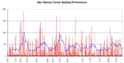 Stewart's batting average (39.54) is the lowest of any player to have scored 8000 or more runs in Test cricket: he is the only player to have scored over 8000 runs despite an average of under 40.[5] However, when played as a specialist batsman in Test cricket, Stewart averaged 46.90 in 51 games with 9 centuries. Since World War II, only Len Hutton, Geoff Boycott, Dennis Amiss and Alastair Cook have bettered Stewart's average of 46 as a specialist opening batsman for England.[6] As wicketkeeper-batsman he averaged 34.92 from 82 tests, higher than many of his contemporaries and many of the current batch of international wicketkeepers. He was unlucky enough to be on the losing side in a record 54 Test Matches.