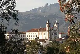 Minas Gerais had the peculiarity of being a more recent settlement area in relation to the Brazilian coast, and there it was possible to build with more freedom, in more updated aesthetics, in this case, the Rococo, a profusion of new churches, without having to adapt or renovate older buildings already established and still in use, as was the case on the coast, which makes them exemplary with regard to stylistic unity. The Rococo ensemble of churches in Minas Gerais is of special importance both for its richness and variety and for being a witness to a very specific phase of Brazilian history, when the region concentrated the attention of the Portuguese metropole for its large deposits of gold and diamonds and constituted the first nucleus of an eminently urban society in Brazil.[42][43] The formulation of a differentiated artistic language in Minas Gerais was also due to two other important factors: its relative isolation from the rest of the colony and the sudden enrichment of the region with the discovery of the gold deposits. The style typically practiced in Minas Gerais had its main center in the old Vila Rica, today Ouro Preto, founded in 1711, but it also flourished vigorously in Diamantina, Mariana, Tiradentes, Sabará, Cachoeira do Campo, São João del-Rei, Congonhas and a number of other mining towns and villages. When gold began to run out, around 1760, the cultural cycle of the region also began to decline, but that was when its characteristic style, at this point already transitioning to Rococo, reached its culmination with the mature work of Aleijadinho and Master Ataíde. The wealth of the region in the 18th century also favored the emergence of an urban elite interested in art, sponsoring artists and appreciating secular works.[44] According to Afonso Ávila,[45]