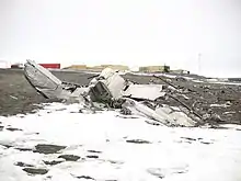- On July 31, 1950, around 17:00 GMT, an RCAF Lancaster 965 from 405 Squadron Greenwood crashed during the establishment of the JAWS weather station when a parachute for resupplies being airdropped became entangled on the tail of the aircraft. The nine crew members were killed. An attempt was made to recover their bodies; an RCAF Canso flying boat was dispatched and landed in Dumbell Bay on August 7. The bodies of the Canadian crew were brought aboard in wooden coffins made from packing crates—the family of Colonel C.J. Hubbard of the United States Weather Bureau requested his remains be buried at Alert[18]—but the combination of the extra weight and a tail wind resulted in an aborted takeoff. The Canso struck ground at the narrow point of Dumbell Bay, damaging the tail section and rendering it useless. Following this, it was decided to bury the crew's remains west of the airstrip, and a military funeral was held the same day. The arrival of the United States Coast Guard icebreaker Eastwind allowed repairs to be made to the Canso.[19] The wreckage of the Lancaster is still visible 500 m (1,600 ft) southwest of the CE building.