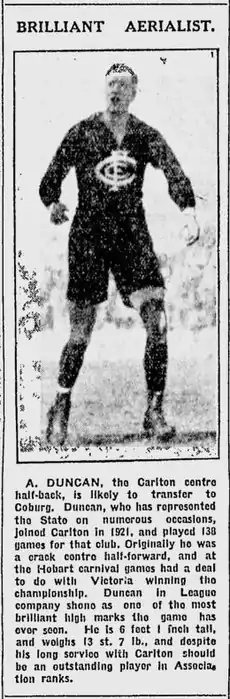 - Duncan had "received a very fine certificate, framed in oak, from the Carlton Foot ball Club for the fine services rendered that Club during the last four years" (Stratford, The Gippsland Times, (Thursday, 26 March 1925, p.3).