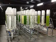 An algae bioreactor is used for cultivating micro or macro algae. Algae may be cultivated for the purposes of biomass production (as in a seaweed cultivator), wastewater treatment, CO2 fixation, or aquarium/pond filtration in the form of an algae scrubber.[1] Algae bioreactors vary widely in design, falling broadly into two categories: open reactors and enclosed reactors. Open reactors are exposed to the atmosphere while enclosed reactors, also commonly called photobioreactors, are isolated to varying extents from the atmosphere. Specifically, algae bioreactors can be used to produce fuels such as biodiesel and bioethanol, to generate animal feed, or to reduce pollutants such as NOx and CO2 in flue gases of power plants. Fundamentally, this kind of bioreactor is based on the photosynthetic reaction, which is performed by the chlorophyll-containing algae itself using dissolved carbon dioxide and sunlight energy. The carbon dioxide is dispersed into the reactor fluid to make it accessible for the algae. The bioreactor has to be made out of transparent material.