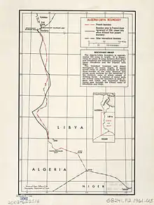 France and Italy signed a treaty on 12 September 1919 which delimited a boundary between Algeria and Libya.[3][2] During the North African Campaign of the Second World War Italy was defeated and its African colonies were occupied by the Allied powers, with Libya split into British and French zones of occupation.[3] Libya was later granted full independence on 2 December 1951.[3] France, which had long been dissatisfied with aspects of the border, signed a treaty with Libya in 1955-6 which altered part of the border between Ghadames and Ghat, thereby enabling more effective administration.[2][3] Following a war Algeria gained independence in 1962, and the border became one between two sovereign states.