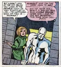 The character plays an integral role in one of the most acclaimed comic book stories of the Silver Age, "The Coming of Galactus," in Fantastic Four #48–50 (March–May 1966). In that story arc, the Silver Surfer first comes to Earth as a herald to the powerful, world-destroying being Galactus, and crashes into Alicia's apartment after fighting the Fantastic Four. Her passionate pleading with him about the value of life convinces him to reject his master and defend the Earth from destruction.[8][9]