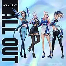 All Out (stylized in all caps) is the first extended play by virtual girl group K/DA. The EP was released on November 6, 2020, through Riot Games and Stone Music Entertainment.[1] The EP contains five songs which feature vocals from the original line-up (G)I-dle, Madison Beer, and Jaira Burns plus a variety of influential singers, such as Bea Miller, Wolftyla, Lexie Liu, Kim Petras, Aluna, Bekuh Boom, and Annika Wells and with Twice members Jihyo, Sana, Nayeon, and Chaeyoung. Each song was produced by one of the fictional members of the group, with the exception of "More".