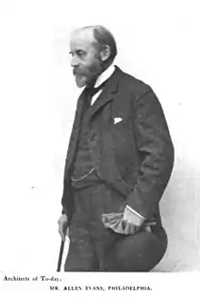 He was the son of Dr. Edmund C. Evans (1813–1881) and Mary S. Allen (1816–1861), of Paoli, Pennsylvania.[1] He attended schools in West Chester,[1] followed by Polytechnic College of Pennsylvania, 1866–68.[2] He worked as a draftsman for architect Samuel Sloan,[1] and was working for Furness & Hewitt by 1872.[3]: 83 When that firm was dissolved in 1875, he remained with Furness, rising to chief draftsman, and partner in 1881.[3]: 85 Four other long-term employees were made partners in 1886, and Furness & Evans was renamed Furness, Evans & Company.[4]
