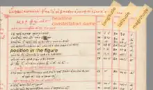 The layout of the catalogue has always been tabular.[8] Ptolemy writes explicitly that the coordinates are given as (ecliptical) "longitudes" and "latitudes", which are given in columns, so this has probably always been the case. It is significant that Ptolemy chooses the ecliptical coordinate system because of his knowledge of precession, which distinguishes him from all his predecessors. Hipparchus' celestial globe had an ecliptic drawn in, but the coordinates were equatorial.[9] Since Hipparchus' star catalogue has not survived in its original form, but was absorbed into the Almagest star catalogue (and heavily revised in the 265 years in between),[10][9] the Almagest star catalogue is the oldest one in which complete tables of coordinates and magnitudes have come down to us.