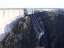 The dam supplies the Villarino Power Station with water via a tunnel for hydroelectric power generation. It is located underground about 14 km (8.7 mi) west of the dam. Water discharged from the power station enters the Douro River. The power station has an installed capacity of 810 MW and was completed in 1977.[2]