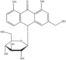 Aloin, also known as barbaloin,[1] is a bitter, yellow-brown colored compound noted in the exudate of at least 68 Aloe species at levels from 0.1 to 6.6% of leaf dry weight (making between 3% and 35% of the total exudate),[2] and in another 17 species at indeterminate levels [Reynolds, 1995b]. It is used as a stimulant-laxative, treating constipation by inducing bowel movements.[3] The compound is present in what is commonly referred to as the aloe latex that exudes from cells adjacent to the vascular bundles, found under the rind of the leaf and in between it and the gel. When dried, it has been used as a bittering agent in commerce (alcoholic beverages) [21 CFR 172.510. Scientific names given include Aloe perryi, A. barbadensis (= A. vera), A. ferox, and hybrids of A. ferox with A. africana and A. spicata.]. Aloe is listed in federal regulations as a natural substance that may be "safely used in food" when used "in the minimum quantity required to produce their intended physical or technical effect and in accordance with all the principles of good manufacturing practice." This food application is generally limited to use in quite small quantities as a flavoring in alcoholic beverages and may usually be identified only as a "natural flavor."