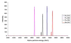 From left to right the peaks are due to 209Po, 239Pu, 210Po and 241Am. The fact that isotopes such as 239Pu and 241Am have more than one alpha line indicates that the (daughter) nucleus can be in different discrete energy levels.
