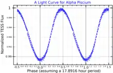 Alpha Piscium is catalogued as an α2 Canum Venaticorum variable, a type of variable star where the brightness changes are caused by the rotation of the star. The brightness varies by about 1/100th of a magnitude, identified from Hipparcos photometry.[4] The primary component is thought to be the source of the variations, and it has a period of 0.845 days which corresponds to the rotation period of the star. Variations with a period of 6.65 days have also been identified in the variations.[21]