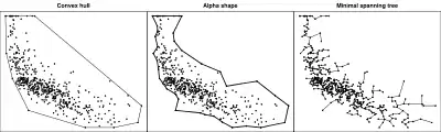In computational geometry, an alpha shape, or α-shape, is a family of piecewise linear simple curves in the Euclidean plane associated with the shape of a finite set of points. They were first defined by Edelsbrunner, Kirkpatrick & Seidel (1983). The alpha-shape associated with a set of points is a generalization of the concept of the convex hull, i.e. every convex hull is an alpha-shape but not every alpha shape is a convex hull.