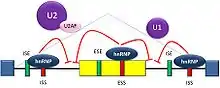 HIV, the retrovirus that causes AIDS in humans, produces a single primary RNA transcript, which is alternatively spliced in multiple ways to produce over 40 different mRNAs.[43] Equilibrium among differentially spliced transcripts provides multiple mRNAs encoding different products that are required for viral multiplication.[44] One of the differentially spliced transcripts contains the tat gene, in which exon 2 is a cassette exon that may be skipped or included. The inclusion of tat exon 2 in the RNA is regulated by competition between the splicing repressor hnRNP A1 and the SR protein SC35. Within exon 2 an exonic splicing silencer sequence (ESS) and an exonic splicing enhancer sequence (ESE) overlap. If A1 repressor protein binds to the ESS, it initiates cooperative binding of multiple A1 molecules, extending into the 5’ donor site upstream of exon 2 and preventing the binding of the core splicing factor U2AF35 to the polypyrimidine tract. If SC35 binds to the ESE, it prevents A1 binding and maintains the 5’ donor site in an accessible state for assembly of the spliceosome. Competition between the activator and repressor ensures that both mRNA types (with and without exon 2) are produced.[43]