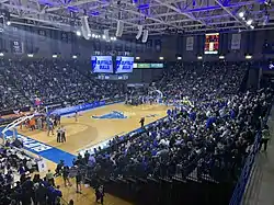 The arena used to seat more than 8,000 people, but a renovation project funded by the Blue & White club reduced the seating to 6,783 by eliminating bleachers and adding chairbacks.[2] The student section was relocated with the renovations. Before the renovations, the students used to generally sit behind the scorer's table, from baseline to baseline, except immediately behind the players' benches. Syracuse's Carrier Dome is the only on-campus college basketball facility in the state that is larger.[2] The volleyball court was constructed for the World University Games in 1993.[2]