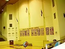 Built in 1963, the Paul S. McBrayer Arena located inside Alumni Coliseum, is capable of seating around 6,500 people in both chairback seats and on wooden benches (8,000 for concerts) arranged in a horseshoe shape, facing a wall at the right side of the arena where staging is usually set up for events. The arena's ceiling is made completely of wooden beams and is believed to be the largest of its kind in existence. It was named for the former EKU Men's Basketball Coach Paul McBrayer who compiled a record of 219-144. The floor graphics were updated for the 2005-06 seasons and the banners were redone to be more unified. The building replaced Weaver Gymnasium, which had been home to the Colonels since 1930.