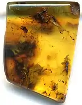 Class Ic is mainly based on enantio-labdatrienonic acids, such as ozic and zanzibaric acids.[42] Its most familiar representative is Dominican amber,.[1] which is mostly transparent and often contains a higher number of fossil inclusions. This has enabled the detailed reconstruction of the ecosystem of a long-vanished tropical forest.[46] Resin from the extinct species Hymenaea protera is the source of Dominican amber and probably of most amber found in the tropics. It is not "succinite" but "retinite".[47]