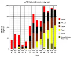 By that year the school began to receive many Asian Americans from Laurel.[31] In the 2010–2011 school year, the AIM system had more than 86% Asian American students, while the overall Oakland Unified School District was 13% Asian. In 2010-2011, the school had no Native American students.[33] As of 2012 more than 90% of the AIPCS student body was Asian American.[6] The next largest ethnic groups were African Americans and Hispanic Americans. In 2009 almost all of the students were low income.[5]
