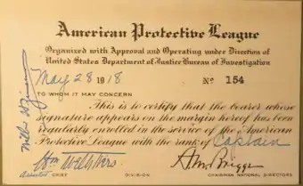 The American Protective League (1917-1919) was an organization of private citizens sponsored by the United States Department of Justice that worked with Federal law enforcement agencies during the World War I era. Its mission to identify suspected German sympathizers and also to counteract the activities of radicals, anarchists, anti-war activists, and left-wing labor and political organizations. At its zenith, the APL claimed 250,000 members in 600 cities.