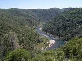 The American River is fed by its North, Middle, and South forks, which are located in El Dorado County, Placer County, and Sacramento County. The river's three forks originate in the Tahoe and Eldorado National Forests.[17] The North and Middle Forks join near Auburn, and continue downstream as the North Fork, although the Middle Fork carries a higher volume of water. The North and South Forks join in Folsom Lake. All three forks are known for their verdant canyons, forested ridges, massive rock formations, trails, back-country winter adventuring among snowy peaks, fishing and white water rafting. There are various fish species that live within the American River such as Chinook Salmon and Steelhead Trout.[18]