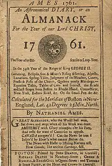 Nathaniel Ames, a second generation colonial American, established and wrote Ames' Almanac.[2] Ames was only seventeen when the first almanac was printed. The family also owned Ames Tavern and often advertised the establishment in the almanac.[3] Upon Ames' death in 1764, his son, also Nathaniel, began writing the almanac. He continued to print the almanac until 1775.[4] The younger Nathaniel strongly supported the antifederalist cause, which contrasted to his brother, the prominent Federalist congressman Fisher Ames. Based on a correspondence between Ames and Roger Sherman, it appears that Sherman wrote some of the mathematical portions of the almanac in 1753.[5]