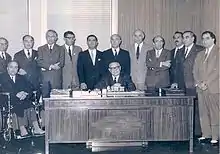 Amir-Abbas Hoveyda (Persian: امیرعباس هویدا, romanized: Amīr 'Abbās Hoveyda; 18 February 1919 – 7 April 1979)[1] was an Iranian economist and politician who served as Prime Minister of Iran from 27 January 1965 to 7 August 1977. He was the longest serving prime minister in Iran's history. He also served as Deputy Prime Minister and Minister of Finance in Mansur's cabinet. After the Iranian Revolution, he was tried by the newly established Revolutionary Court for "waging war against God" and spreading corruption on earth (Mofsed-e-filarz) and executed.
