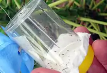 A vial containing Anagyrus lopezi, at a release ceremony organised and hosted by the Thai Department of Agriculture in the country's northeastern Khon Kaen province. The wasp is being used to help control cassava mealybug outbreaks in the country.