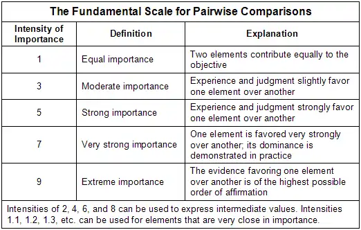 Cargo capacities for the alternatives vary from 14 to 148 cubic feet (4.2 m3). If they wanted to, the Jones family could enter these capacities directly into the AHP software. But that would mean that, when considering Cargo Capacity, a car with 148 cu ft (4.2 m3). of it would be over ten times as desirable as one with only 14. Given the car's use as a family vehicle, that doesn't seem quite right. So the family looks at the available capacities and determines that a 14 cu ft (0.40 m3). trunk is perfectly fine for their needs, that something about five times larger is slightly better, and that something about ten times larger is moderately so. These judgments correspond to values of 1, 2, and 3 on the AHP's Fundamental Scale.