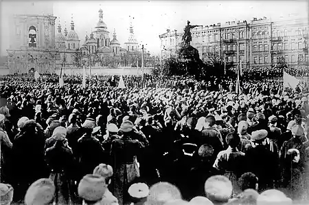 The outbreak of the February Revolution brought with it a resurgence in anarchist activity in Ukraine.[55] Within the month, anarcho-syndicalist circles had been organized in the factories of Ukraine's largest industrial cities and miners in Donbas had adopted the preamble to the Industrial Workers of the World's constitution.[56] In May 1917, the adoption of workers' control as Bolshevik policy was welcomed by many Ukrainian anarcho-syndicalists, with one proclaiming that "since the time of the revolution, the [Bolsheviks] have decisively broken with Social Democracy, and have been endeavoring to apply Anarcho-syndicalist methods of struggle."[57] By this time, anarcho-syndicalists in Donbas had begun to reject traditional trade unions in favor of the newly established factory committees, which they considered to be more in line with revolutionary syndicalism.[58]
