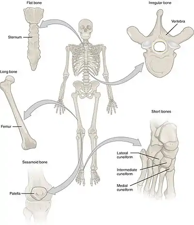Many anatomical terms descriptive of bone are defined in anatomical terminology, and are often derived from Greek and Latin. Bone in the human body is categorized into long bone, short bone, flat bone, irregular bone and sesamoid bone.