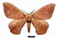 The wingspan is 37–39 mm. The head is covered with reddish-brown hairs. There is a black discal spot on the forewing, which has a smooth outer margin and is not falcate apically.[1]