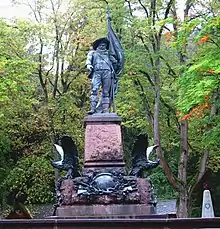In 1818, his family was given a patent of nobility by the emperor of Austria (he and Anna had 7 children, at least two of whom emigrated to America). In 1823, Hofer's remains were moved from Mantua to Innsbruck, and in 1834, his tomb was decorated with a marble statue. In 1893, a bronze statue of Hofer was erected in Bergisel (Innsbruck). A large painting depicting his arrest hangs in the Palace of Maria Theresa in Innsbruck, and there is an annual open-air play in Meran based on his life. In Meran there is also a monumental statue of him opposite the train station at the beginning of the Via Andreas Hofer, which was erected by Tyrolean nationalists in 1915. In New Glarus, Wisconsin there is a large mural of Hofer inside Puempel's Olde Tavern.[4]