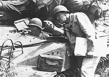 At Leyte, in the Philippines, the division was responsible for taking Palompon, the last main port the Japanese held on the island. During the ten-day battle for that area of the island, from December 21 through December 31, 1944, the division estimated that they had killed 5,779 Japanese soldiers and taken 29 prisoners, with only 17 Americans killed, 116 wounded, and 6 missing in action.[8] For his service the government of the Philippines later awarded him the Philippine Legion of Honor, the Philippine Liberation Medal, and the Presidential Unit Citation.[2]