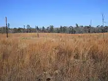 Andropogon virginicus has also been introduced to Japan and Australia. It competes with other species by allelopathy, releasing persistent herbicidal chemicals from its dying tissues, such as decaying leaves.[2][3][4] A. virginicus colonizes disturbed areas such as abandoned mining sites. It is a weed of pastures and grazing ranges, where it proves less palatable and nutritious to cattle than other grasses.[2] This species is tolerant of fire and grows back quickly and more abundantly after a burn.[2] It is perhaps most problematic in Hawaii, where its natural growth patterns are out of synch with the local climate. It is dormant during the Hawaiian rainy season, dying back and leaving the slopes it has colonized exposed and vulnerable to significant erosion.[5] Despite its weediness, the grass is sometimes grown as an ornamental plant.[6]