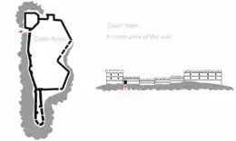 The Anevo Fortress is dominated by its fortified inner city or citadel, surrounded by defensive walls with gates and towers. The entire fortress was around 7,000–8,000 square metres (75,000–86,000 sq ft) in area, of which 5,000 m2 (54,000 sq ft) are taken up by the citadel and other archaeological remains, the unfortified part of the city measured around 1,000 m2 (11,000 sq ft) and a monastery with adjacent buildings amounted to 1,000–1,500 m2 (11,000–16,000 sq ft). In total, the Anevo Fortress is thought to have had eight defensive towers, of which only several have been preserved. The towers are either rectangular or polygonal in shape,[5] and their ruins reach up to 12 metres (39 feet) in height.[6]