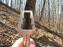 An angle gauge is a tool used by foresters to determine which trees to measure when using a variable radius plot design in forest inventory. Using this tool a forester can quickly measure the trees that are in or out of the plot. An angle gauge is similar to a wedge prism though it must be held a fixed distance from the eye to work properly. Unlike the wedge prism, which is held over the plot center, the surveyor's eye is kept over plot-center when using an angle gauge.